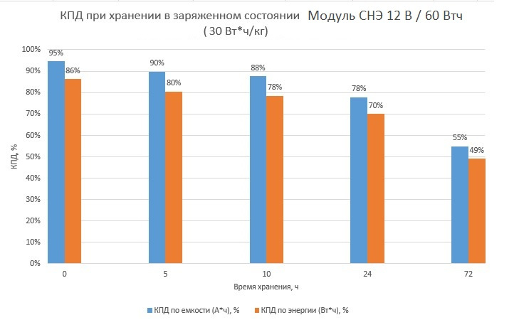 Наши батареи не предназначены для длительного хранения электроэнергии. Относительно высокий саморазряд обеспечивает цикличность и ресурс батарей, но не позволяет эффективно хранить электроэнергию в течение длительного времени. Модули способны эффективно работать в суточных и часовых циклах заряд/хранение/разряд с КПД свыше 80% по энергии (Вт·ч, Wh) и свыше 90% по емкости (А·ч, Ah), что не уступает другим типам аккумуляторов в таком режиме. Таким образом, для наших батарей целесообразно выбирать режим эксплуатации, подразумевающий заряд-разряд в суточном или более коротком режиме.